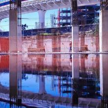 La fotografía es una estampa simétrica de los cimientos de una construcción, en donde los trabajadores se camuflan entre pilares de concreto y varilla y con el tren ligero tapatío de fondo, mientras toda esta imagen se refleja en el agua que inunda la obra.