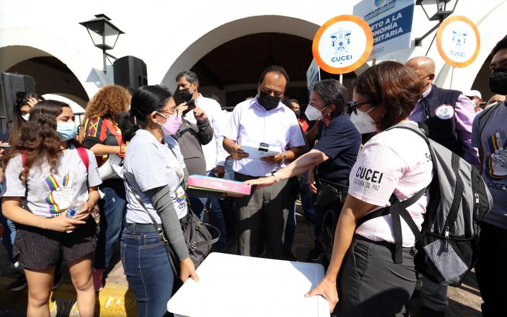 Al llegar a Casa Jalisco, el contingente de CUCEI, entregó 4 mil cartas firmadas por universitarios y ciudadanos y con las que se exige que se devuelvan los 140 millones de pesos que el gobierno estatal recortó a la UdeG y que estaban destinados a la construcción del MCA.