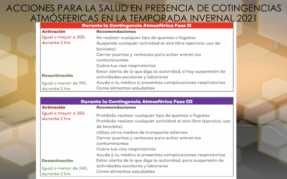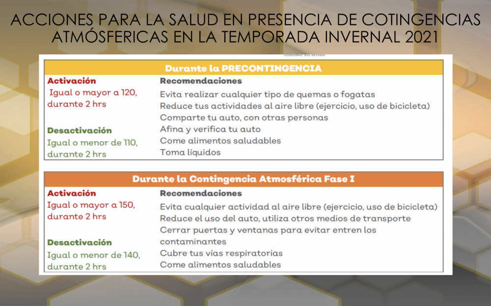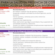 Las contingencias atmosféricas se producen en invierno por la quema de pirotecnia, fogatas, emisiones industriales y quemas de residuos que provocan la inversión térmica con la suspensión de contaminantes.