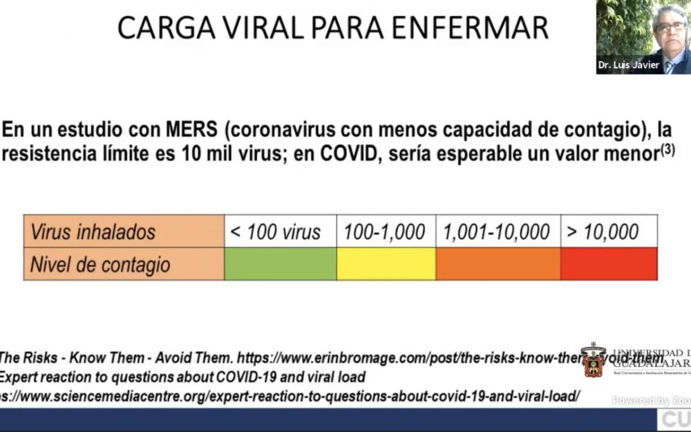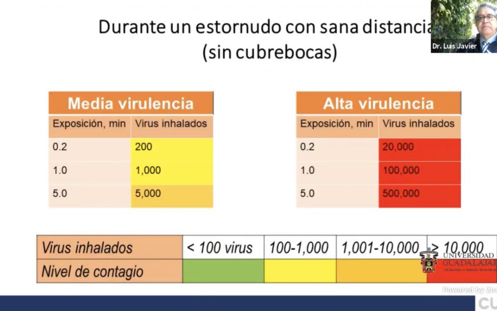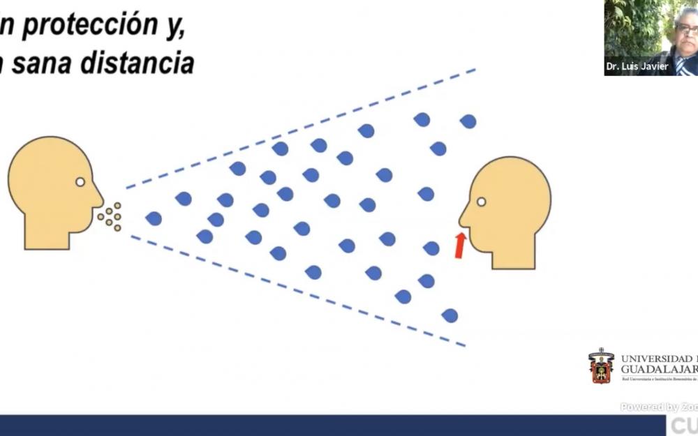 La efectividad de la sana distancia y los filtros sanitarios fueron cuestionados por el doctor Luis Javier González Ortiz, Coordinador del doctorado en Ciencias Químicas, del Centro Universitario de Ciencias Exactas e Ingenierías (CUCEI), durante su conferencia “¿Cómo protegernos del COVID19? Una visión científicamente soportada”.