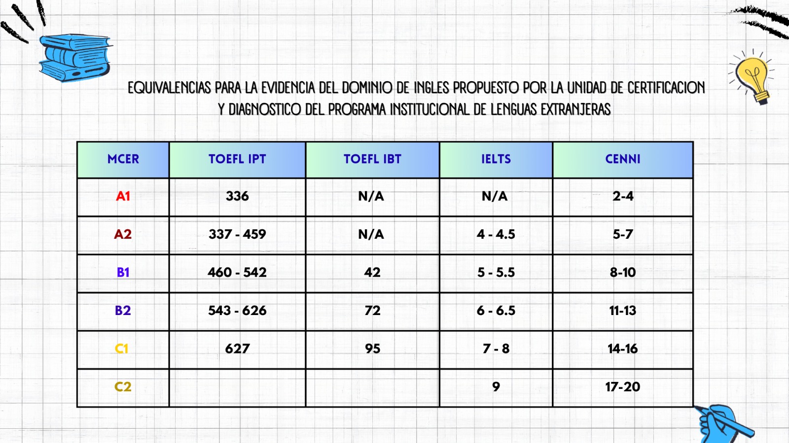 Equivalencias de inglés por la Unidad de Certificación y Diagnóstico del Programa Institucional de Lenguas Extranjeras (MCER, TOEFL, IELTS, CENNI).