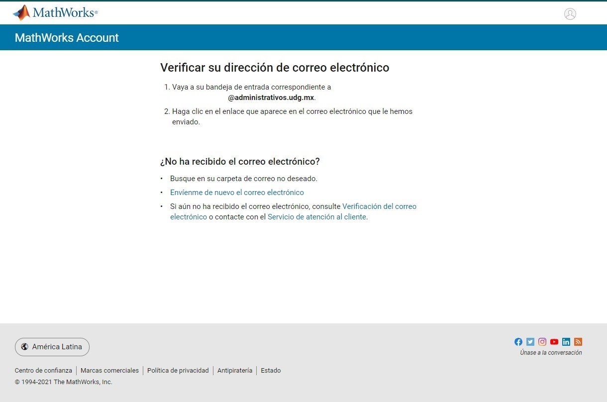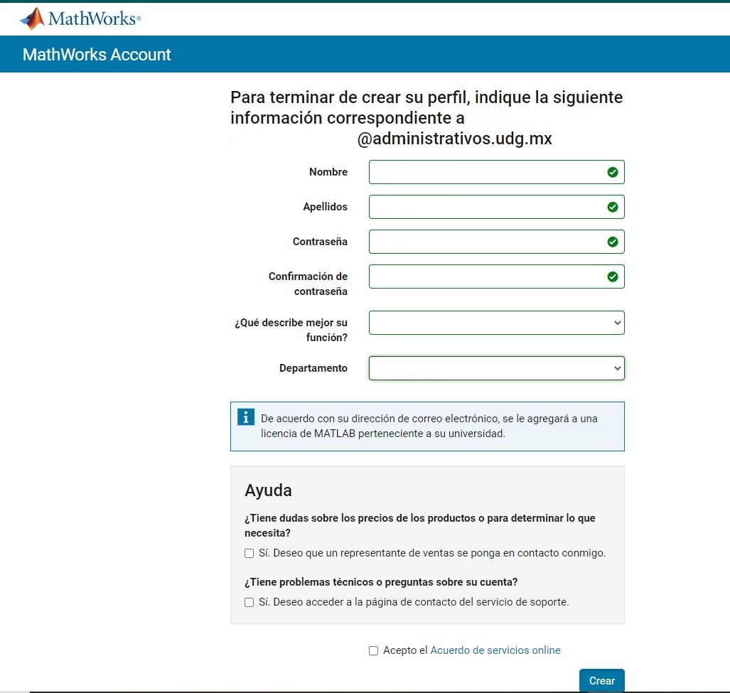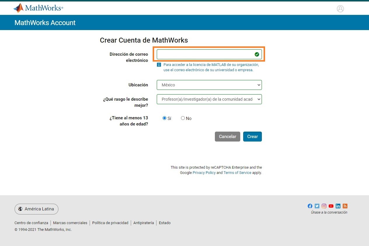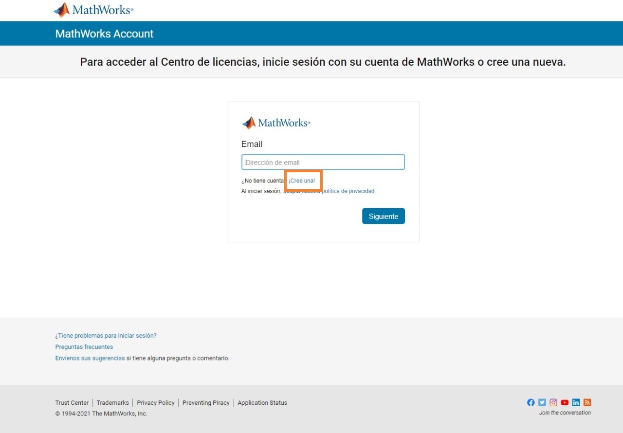 Como no te has registrado en MathWorks deberás de crear una cuenta nueva