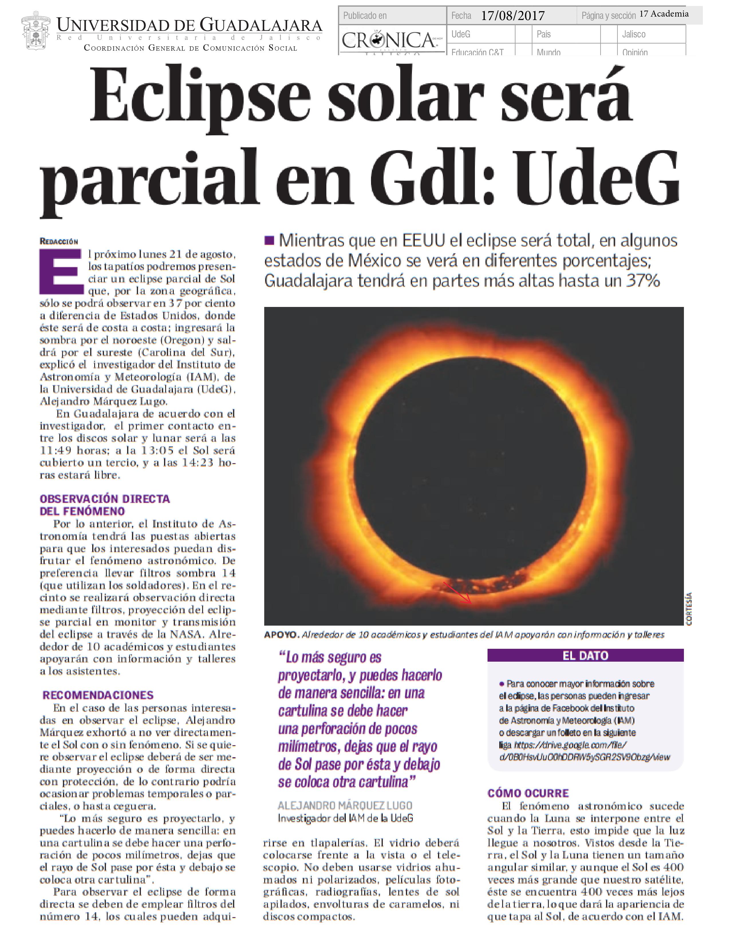 Eclipse solar será parcial en Gdl: UdeG