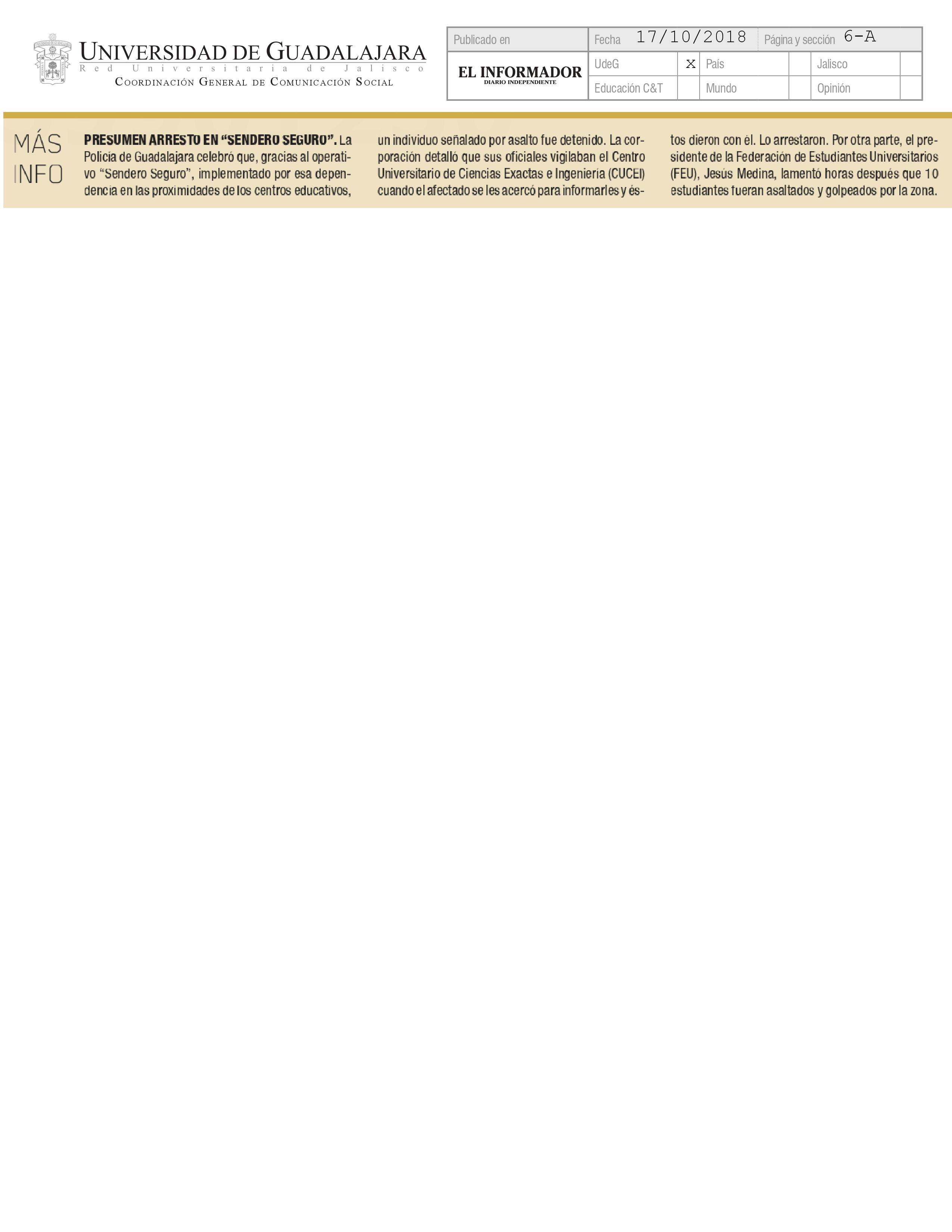 Presumen arresto en "Sendero Seguro"
