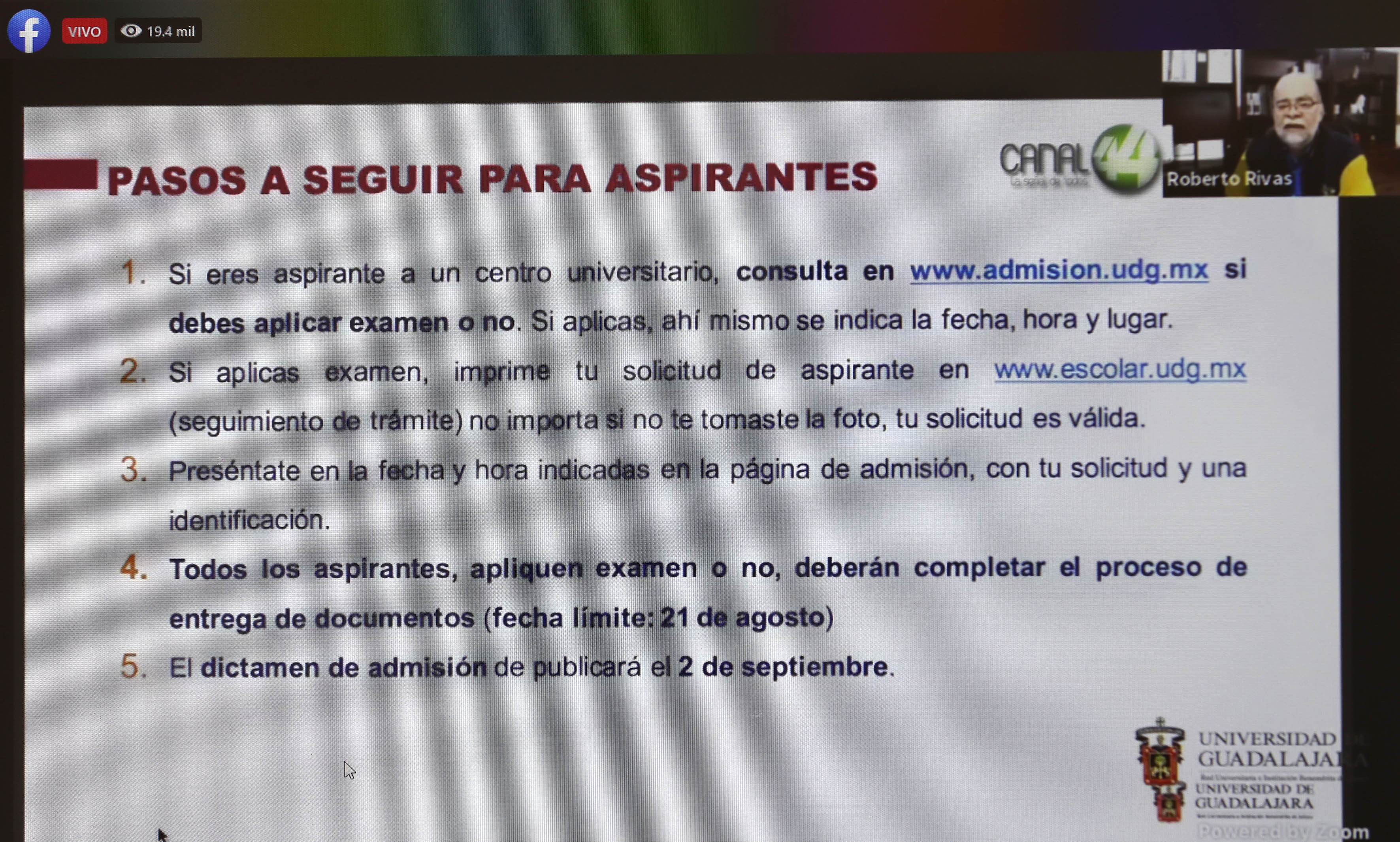 Con estas medidas, únicamente 29 por ciento de los aspirantes a licenciaturas en la UdeG aplicarán examen de admisión. Es decir, solamente 40 mil 845 de un total de 140 mil 359 aspirantes, informó en rueda de prensa virtual el Rector General de esta Casa de Estudio, doctor Ricardo Villanueva Lomelí.