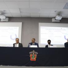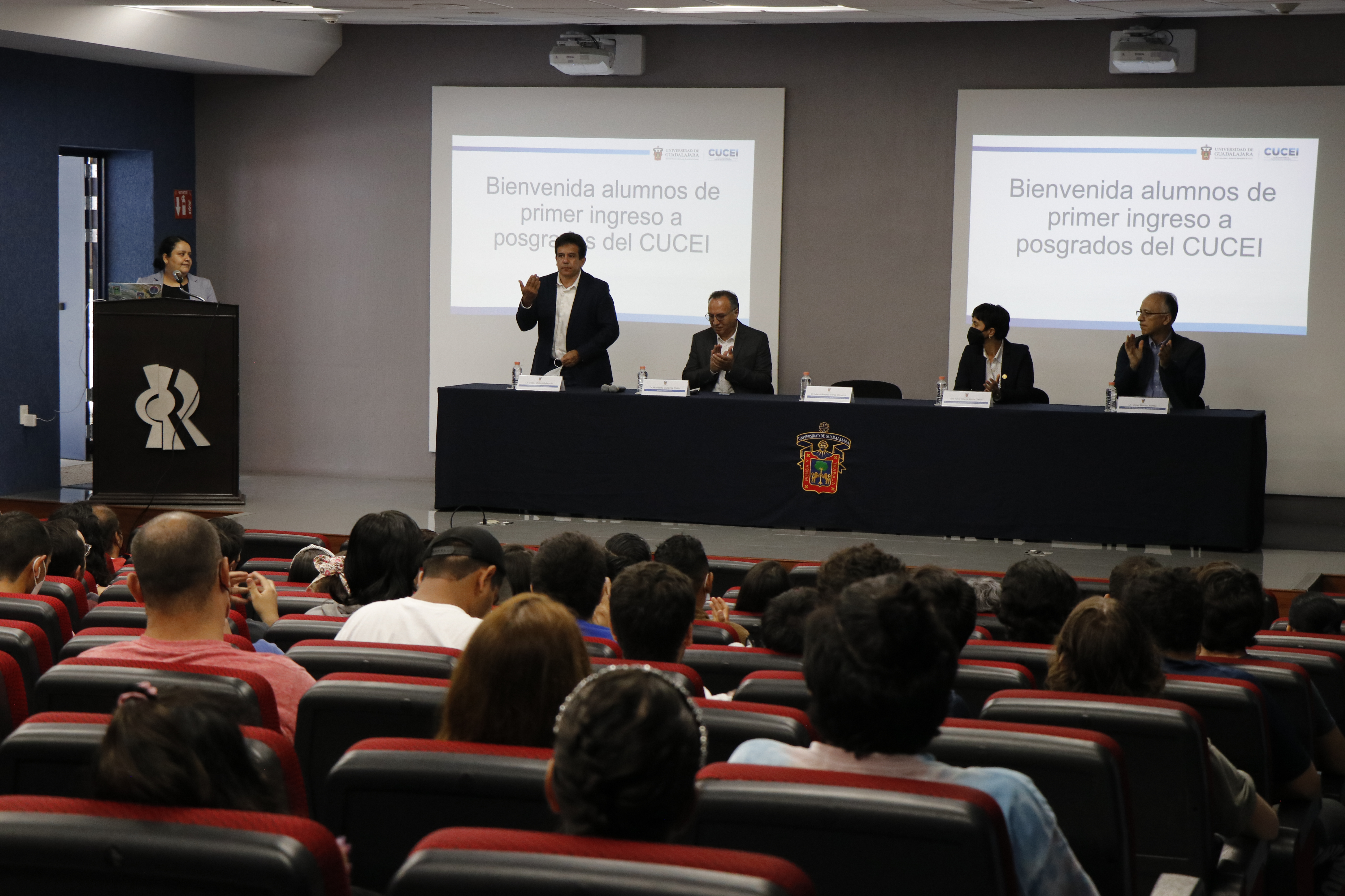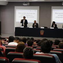 El Rector Dr. Marco Antonio Pérez Cisneros, en compañía del Secretario Académico Dr. Humberto Gutiérrez Pulido, los directores de División Dra. Alma Yolanda Alanís correspondiente a la División de Tecnologías para la Integración Ciber- Humana, Dr. Oscar Blanco Alonso Director de la División de Ciencias Básicas y el Dr. Cesar Octavio Monzón Director de la División de Ingenierías dieron la bienvenida a los 130 alumnos que estarán formando parte de la oferta académica de maestrías y doctorados que ofrece CUCEI.