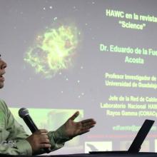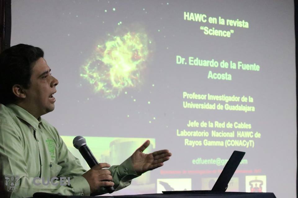El Dr. Eduardo de la Fuente Acosta, investigador del Departamento de Física del CUCEI y Coordinador de la red en cables en HAWC, dio a conocer la noticia en una charla denominada “Entre antimateria y materia oscura” el día 16 de noviembre en el auditorio del módulo Y.