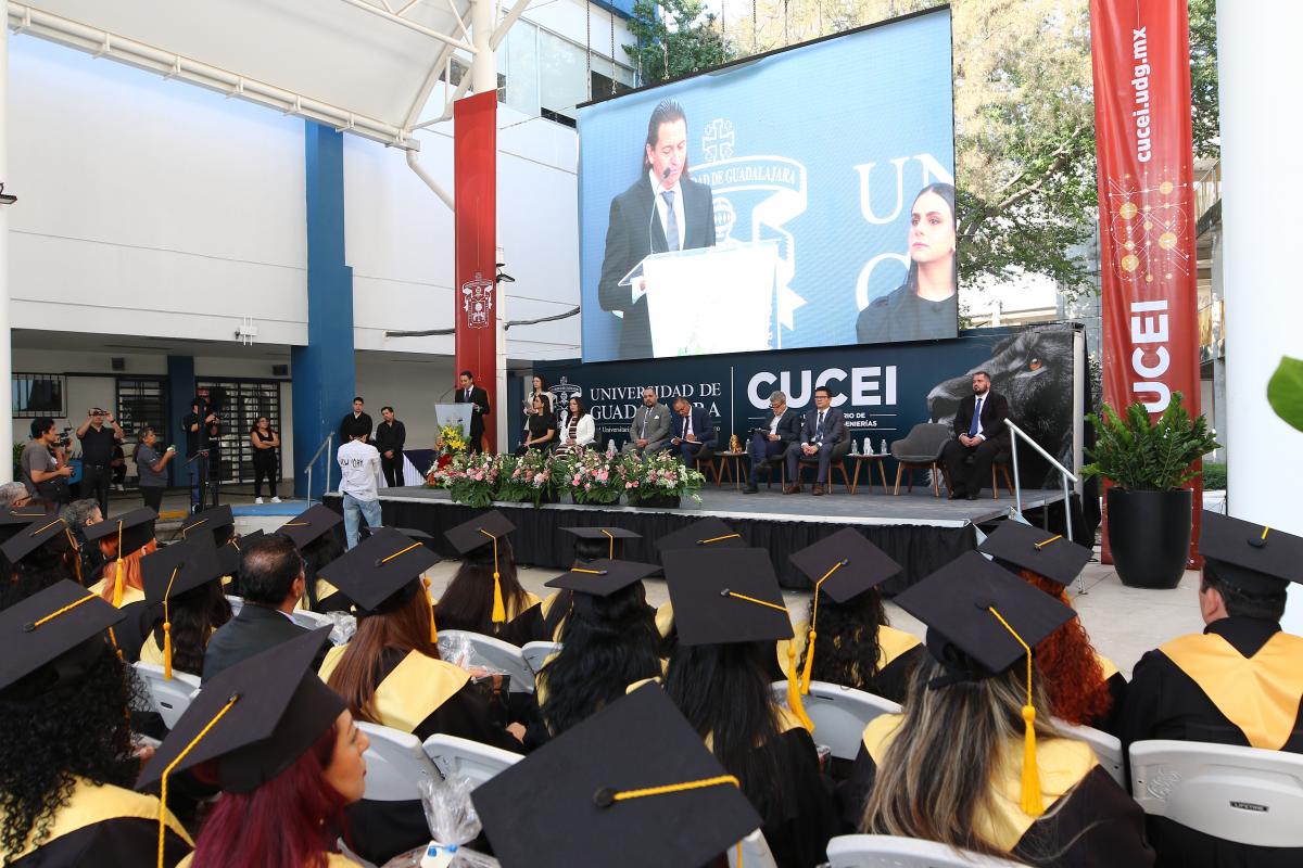 Durante el acto académico de esta generación, realizado este sábado por la mañana en el CUCEI, el Rector de dicho plantel, doctor Marco Antonio Pérez Cisneros, resaltó que este tipo de programas académicos son posibles gracias a la colaboración con Jabil, el compromiso de las y los docentes de este plantel y el trabajo del ITRANS.