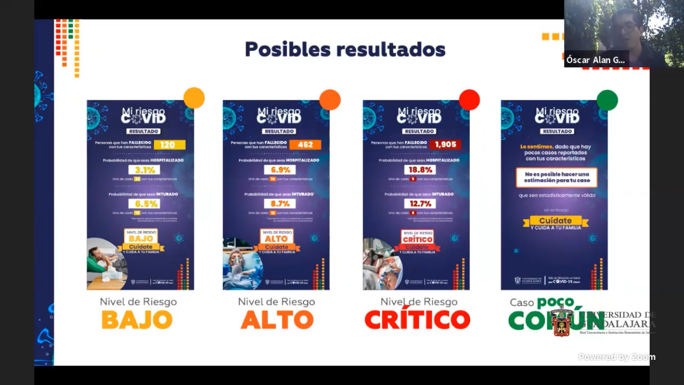 El Rector General de esta Casa de Estudio, doctor Ricardo Villanueva Lomelí, aseguró que es una herramienta para que las personas conozcan las proyecciones reales de sufrir una complicación en caso de contagiarse con el SARS-Cov-2, y que será útil para hacer conciencia del riesgo que corren cuando acuden a reuniones o a actividades no esenciales en el momento crítico que vive la entidad por la alta incidencia de casos positivos y hospitalizaciones.