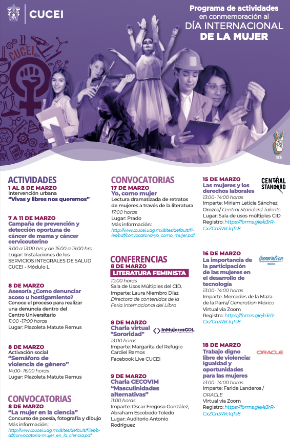 Por tal razón, el plantel realiza una serie de convocatorias, conferencias y actividades como parte del programa de actividades en conmemoración del Día de la Mujer, en el que podrán participar la comunidad universitaria y todo público, y que se puede consultar en el sitio http://www.cucei.udg.mx/