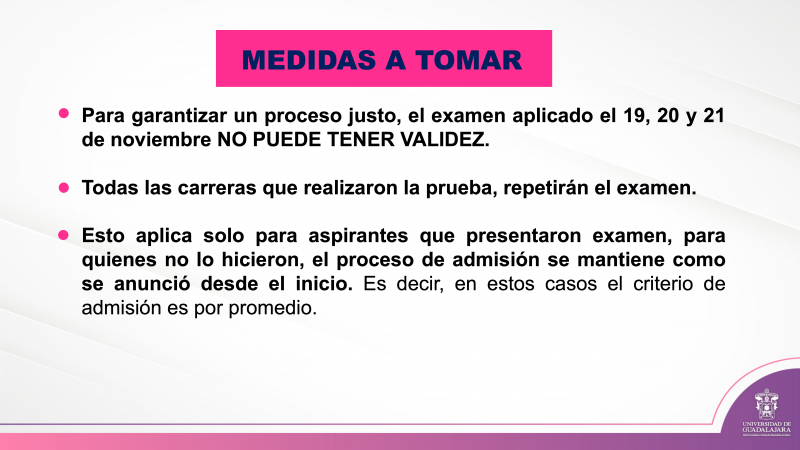 “Durante más de 30 años, la Universidad de Guadalajara ha implementado una serie de protocolos para garantizar un proceso de admisión limpio, justo y equitativo. No vamos a permitir que se cometan injusticias por situaciones como ésta”, advirtió Villanueva Lomelí e informó de la anulación de los resultados del examen realizado en noviembre. Asimismo, se repetirá la aplicación de la prueba el próximo 6 de febrero, el 15 de febrero se publicarán los resultados y el 22 de febrero será el inicio de clases.