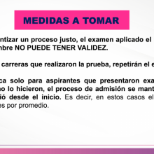 “Lamento mucho que los estudiantes que ya hicieron examen tengan que hacerlo de nuevo. Entiendo la frustración que sienten en estos momentos y la comparto; pero no perdamos de vista lo más importante: no podemos permitir que alguno o alguna de ustedes pierda su lugar en la Universidad porque alguien tuvo ventaja”, dijo el Rector General.